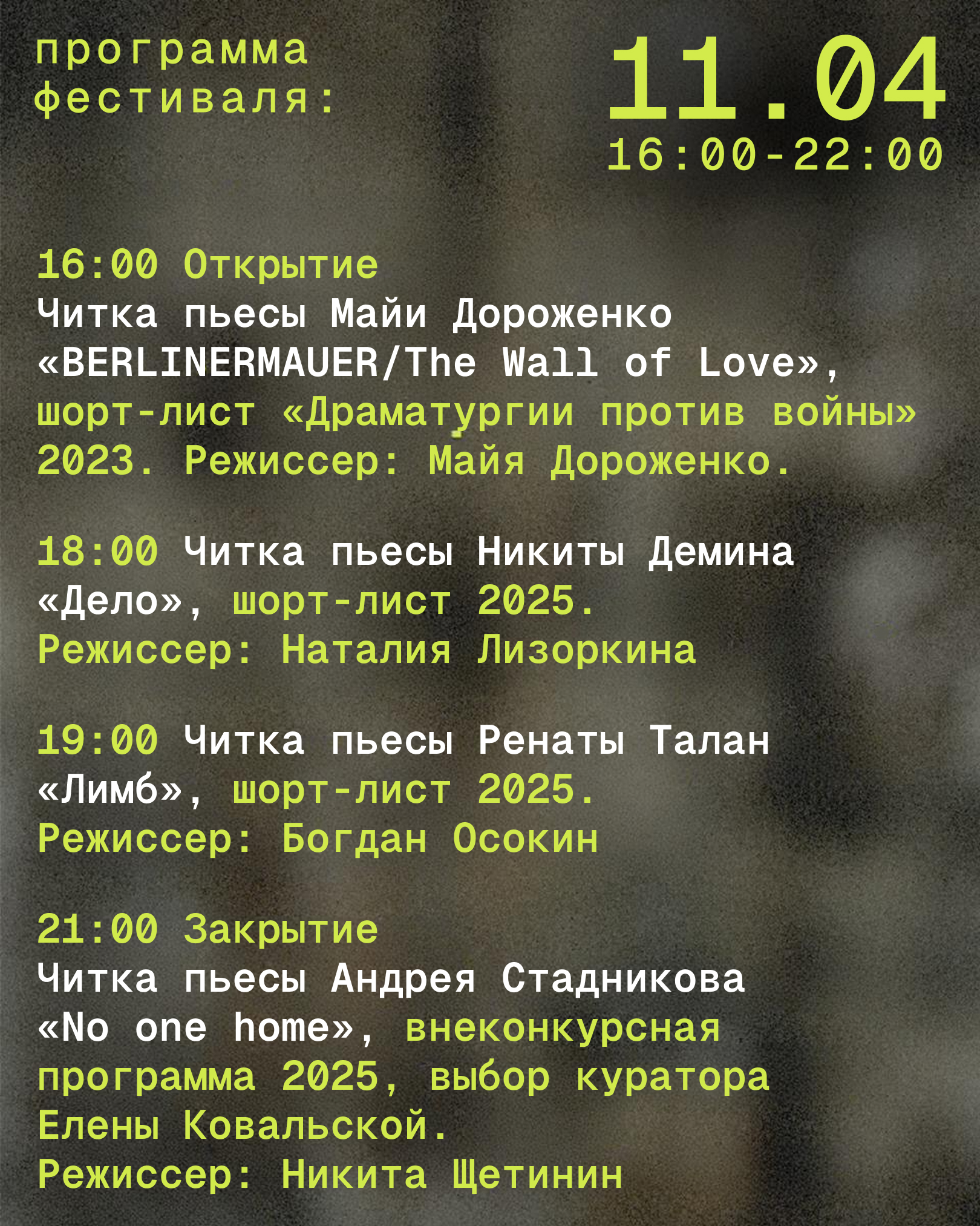 18:00 Тбилиси / 17:00 мск — Никита Демин «Дело». Пьеса о том, как человеческое превращается в набор документов. Режиссер: Наталия Лизоркина.